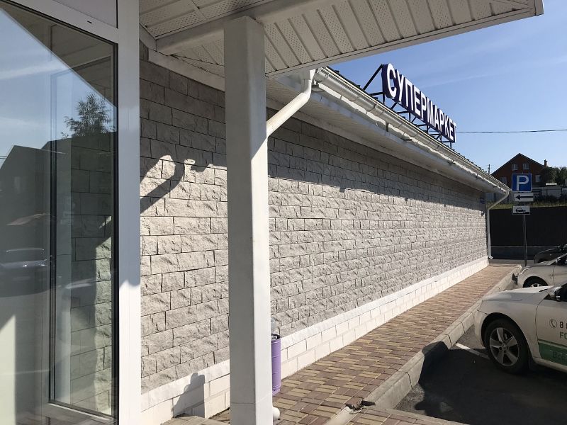 Углы в цвете «перламутровый» — идеальное дополнение для фасадных панелей с эффектом крупноформатной каменной кладки. Спокойный многогранный цвет и швы в тон материала делают стык панели и угла практически незаметным.